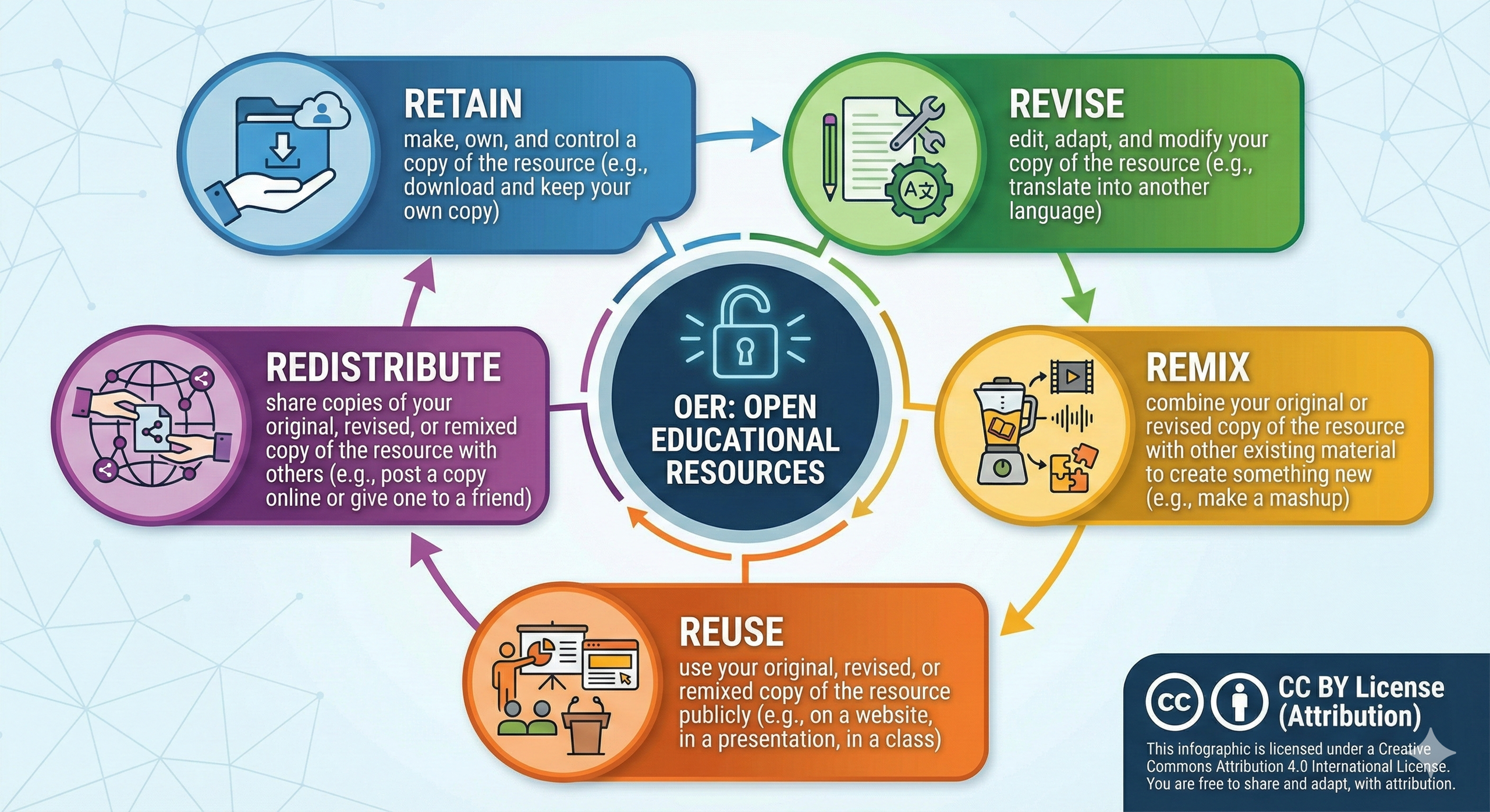 In practical terms, this means you can retain a permanent copy, reuse the material in your teaching, revise and update the content, remix it with other materials, and redistribute it to colleagues. These five permissions, sometimes called the “5 Rs,” distinguish OER from non-open copyrighted materials (Wiley, 2015).
